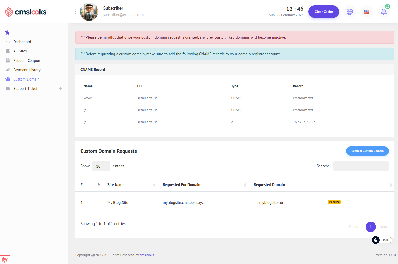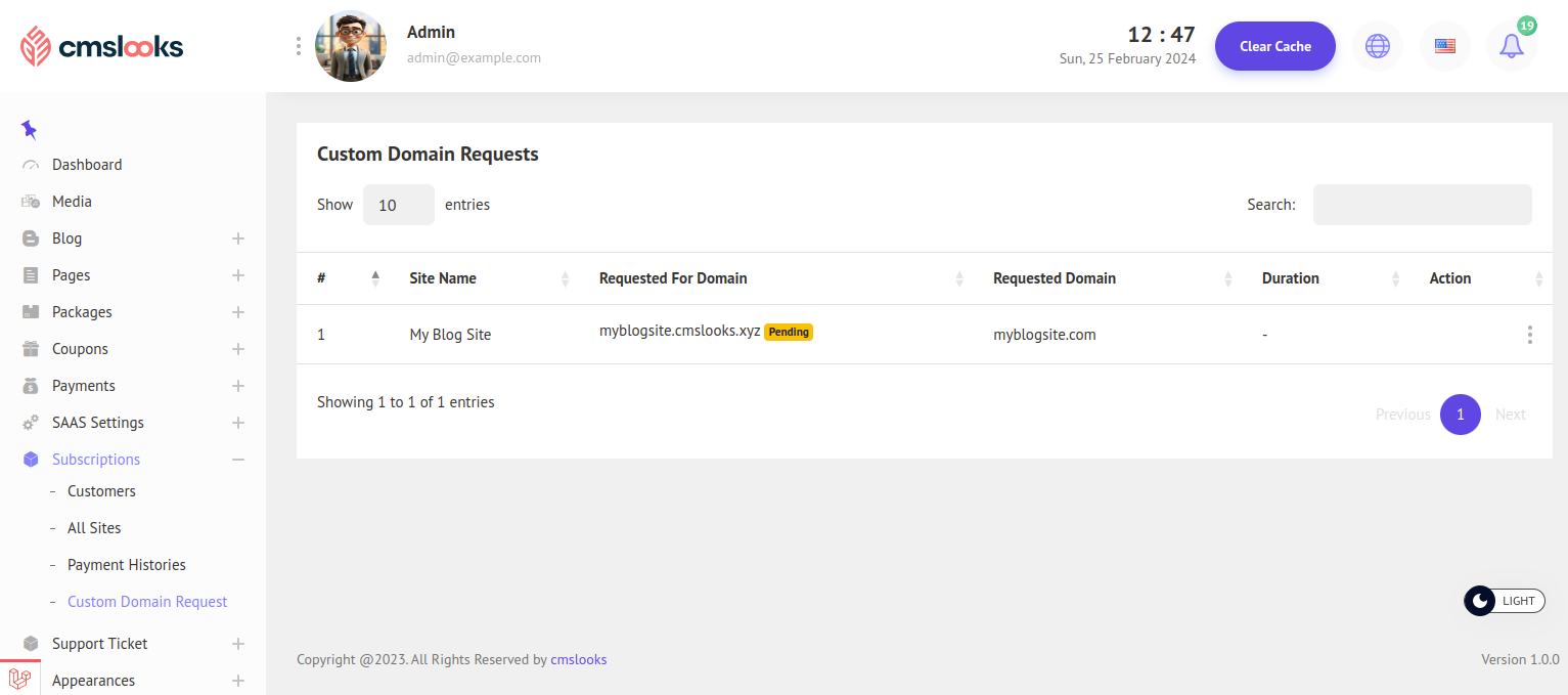 1. Admin can see all the custom domain request lists by clicking "Subscriptions > Custom Domain Request".