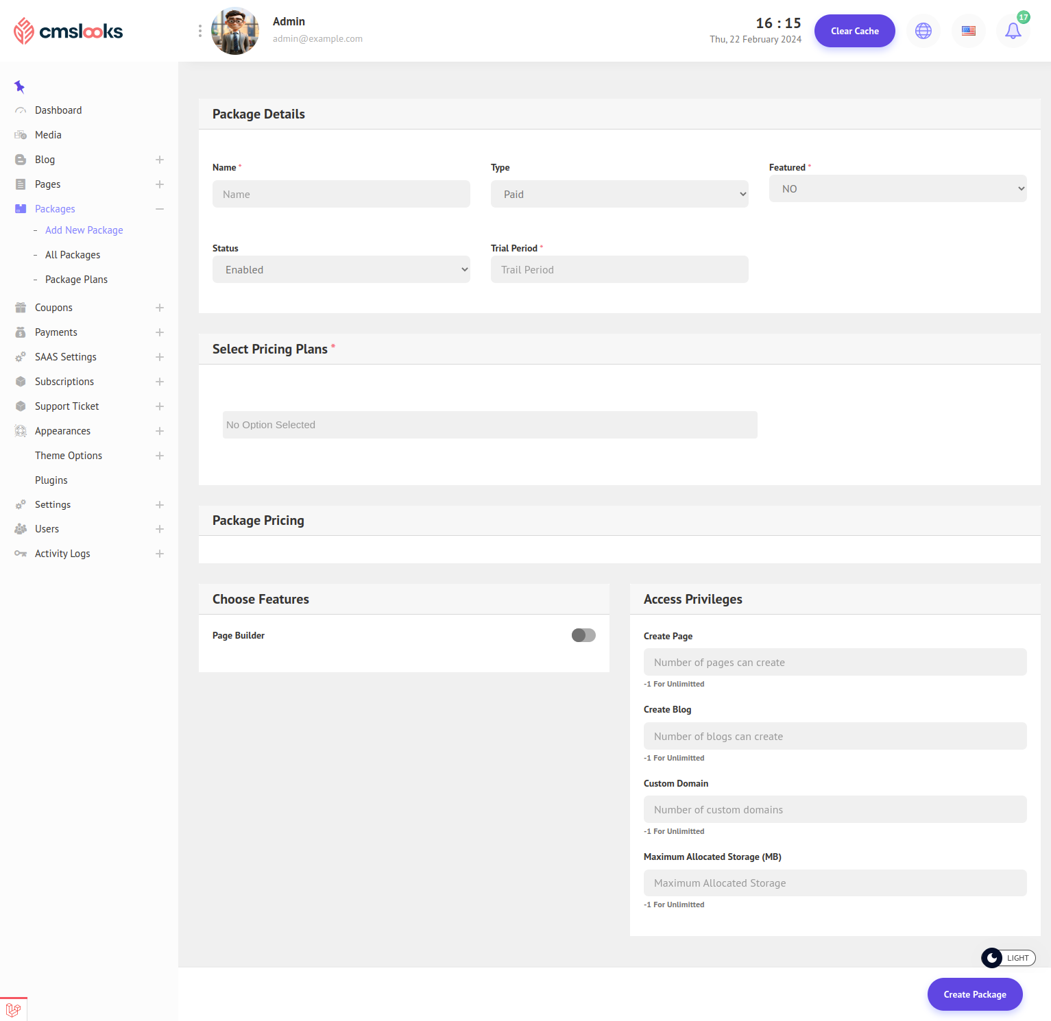 2. In the package adding form fill in all the basic information, select pricing plans, set prices for the plans, add features, access privileges, and payment gateways, and finally click the "Create Package" button to create a package.