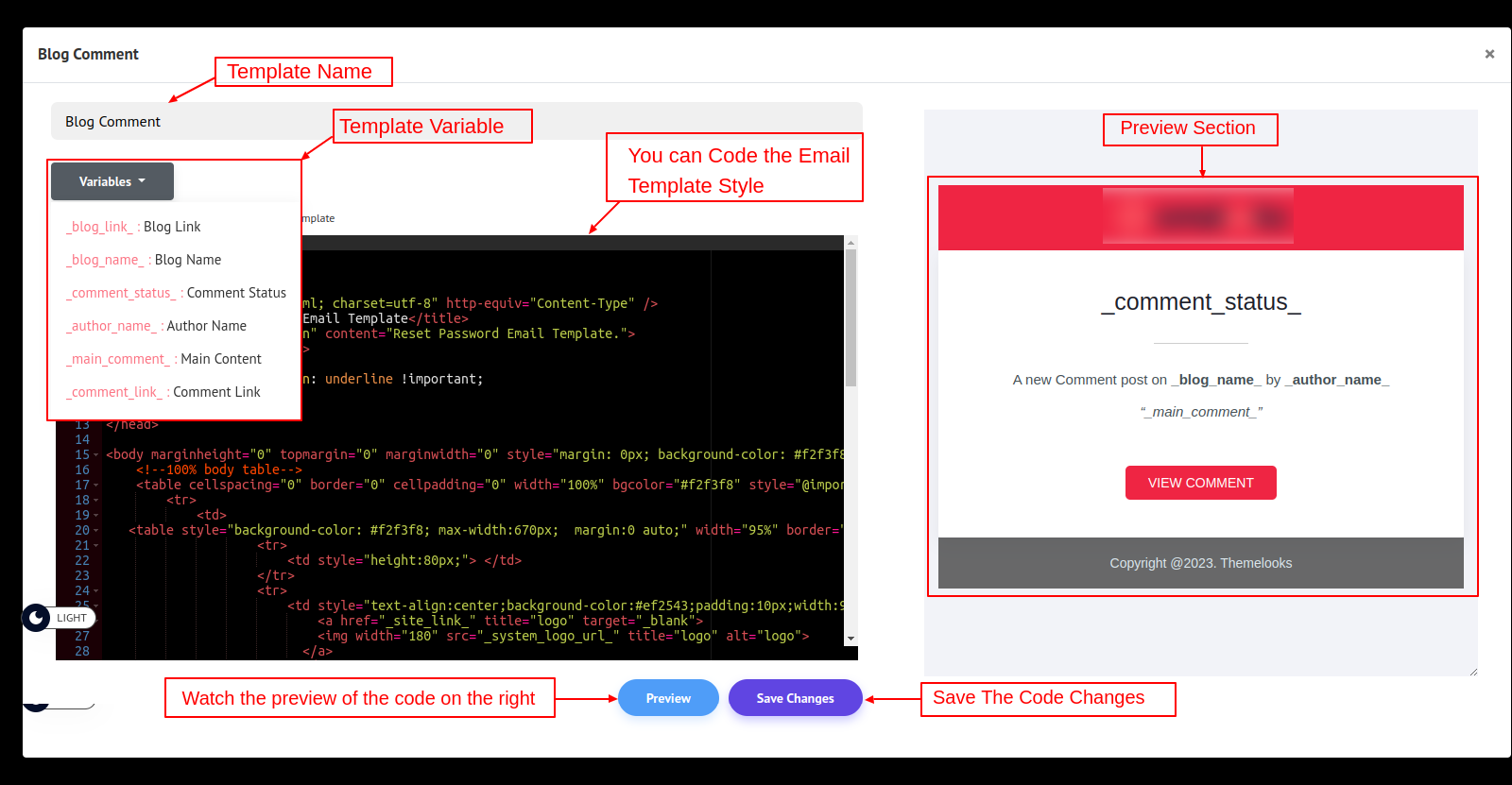 As you can see in the below image, the modal is divided into two sections. The left side is a Code Editor, where the template code is written. And the right side is a Preview box where you can see the preview for that code. Make changes to the code and click Preview to view the update.