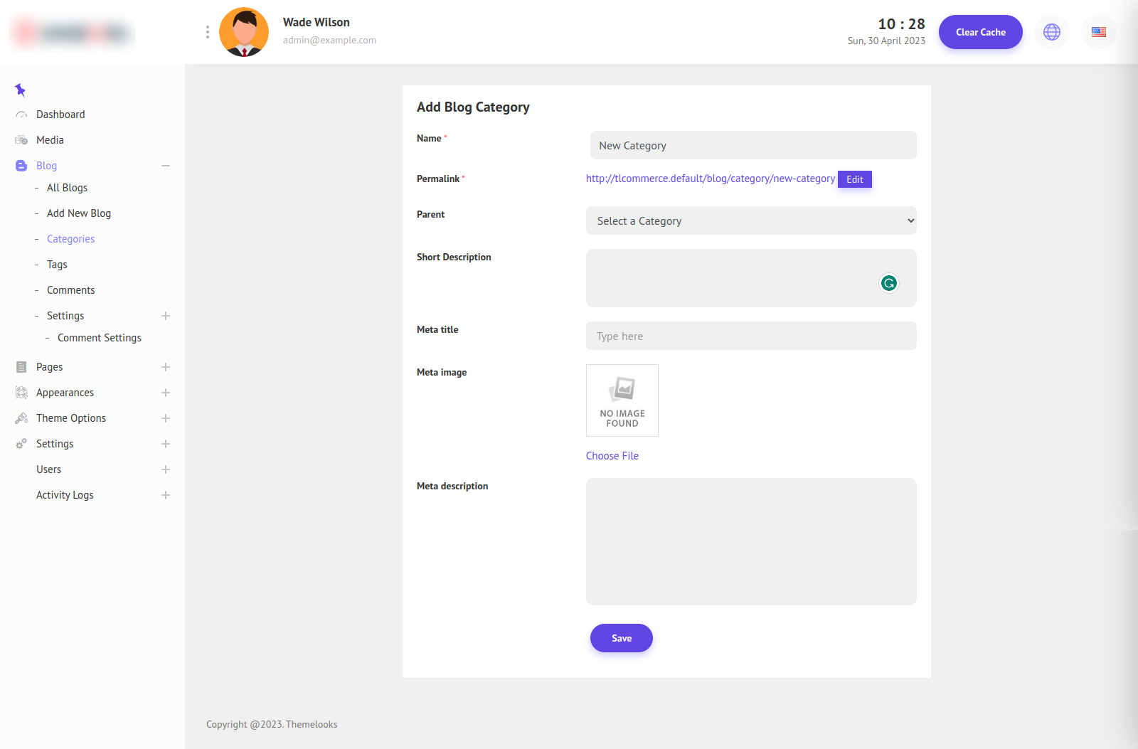To create a new category click Add Blog Category button and you will be redirected to another page. Here you can give a name and edit the permalink, select a parent, and set SEO information.