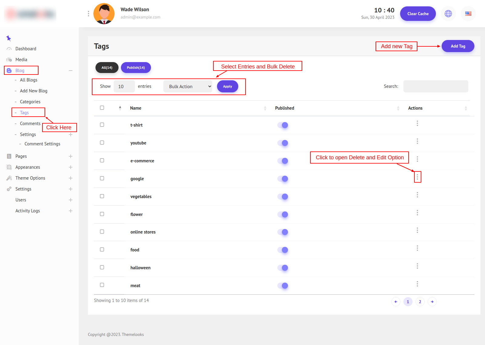 In this post, we will learn how to manage Blog Tags. Follow Blogs > Tags and you will be redirected to the tag list page. Here you can find all the available tags, you can search and find, filter, manage, delete and create new ones.