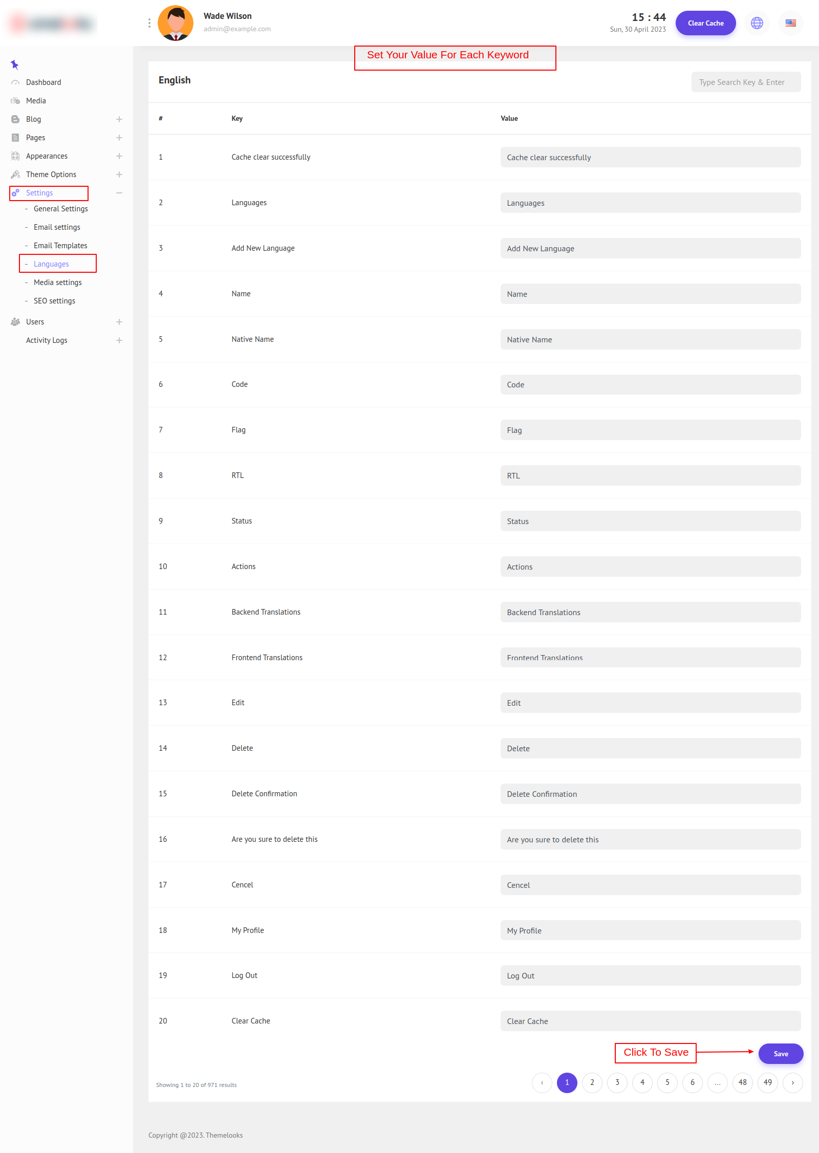 You can Translate Frontend and Backend Keywords from Language List Action Options. Click which keywords you want to set abd it will redirect you to that page. You can write value for every keywords.