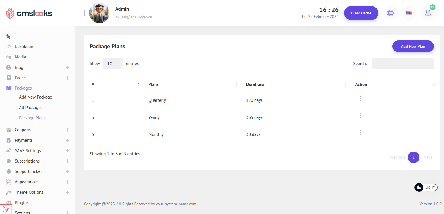 1. Click Packages > Package plans this action will redirect you to the package plans. On the top right side, you will see the "Add New Plan" button. Click on the button and fill in all the necessary details in the form, thus you can create new package plans