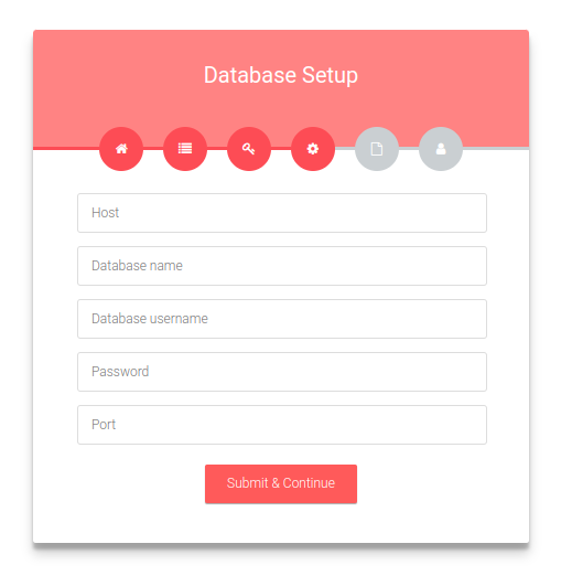 Now on the Database Setup page, you need to set DB Host, DB Name, DB Username, DB Password, and DB Port. Now click Submit & Continue.