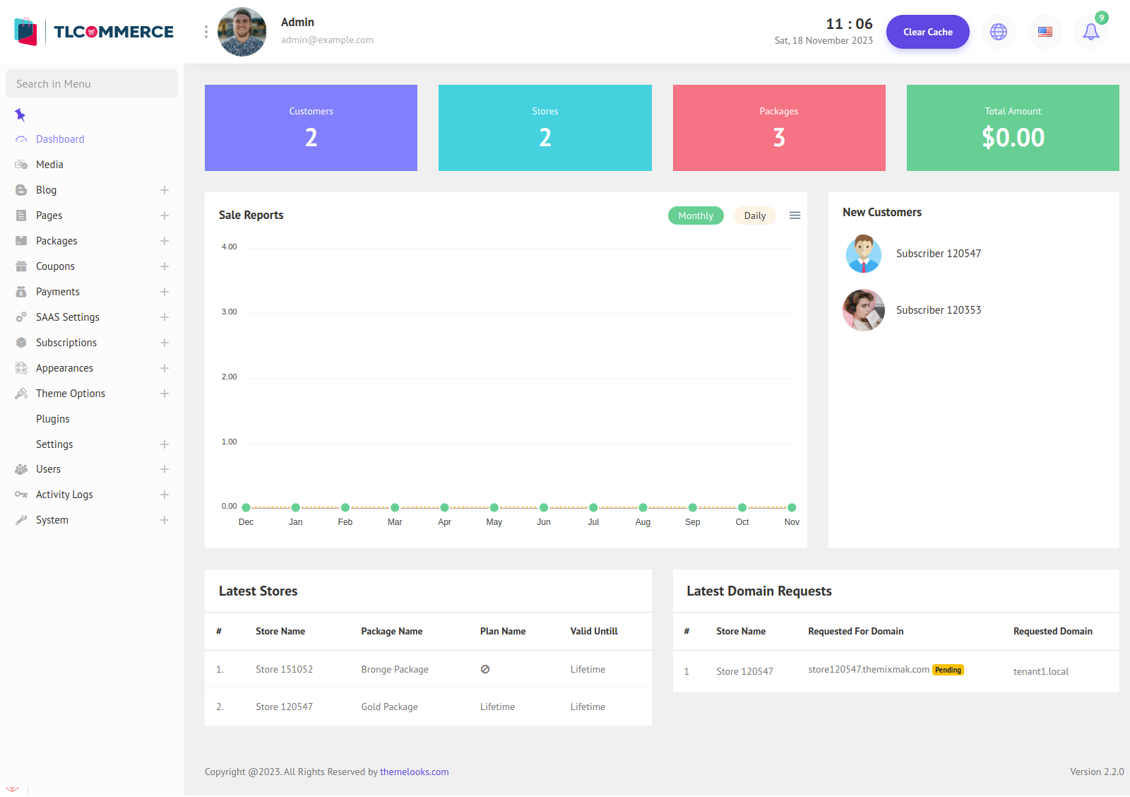 Here you can find the total customers, total stores, total packages and also total sales amount. You can see the sales report by graph monthly and daily. You will also be able to see New Customers, Latest Stores, New domain Request here.